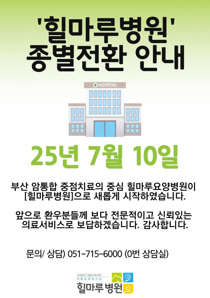2025년 6월 10일부로 '힐마루병원'으로 종별 전환을 하였습니다.
